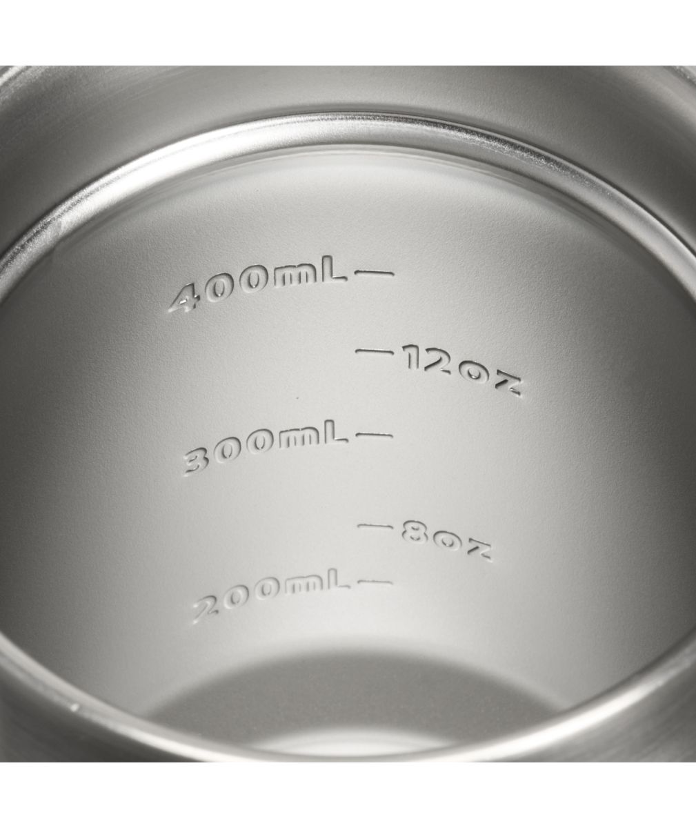 Hrnček je vybavený tritánovým viečkom s tesnením, ktoré chráni proti rozliatiu a obmedzuje únik tepla. Pevná oceľová rukoväť umožňuje pohodlné držanie aj v rukaviciach, široké hrdlo uľahčuje pitie, umývanie aj pridávanie ľadu a vnútorné objemové rysky umožňujú presné dávkovanie nápoja.
