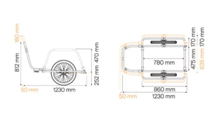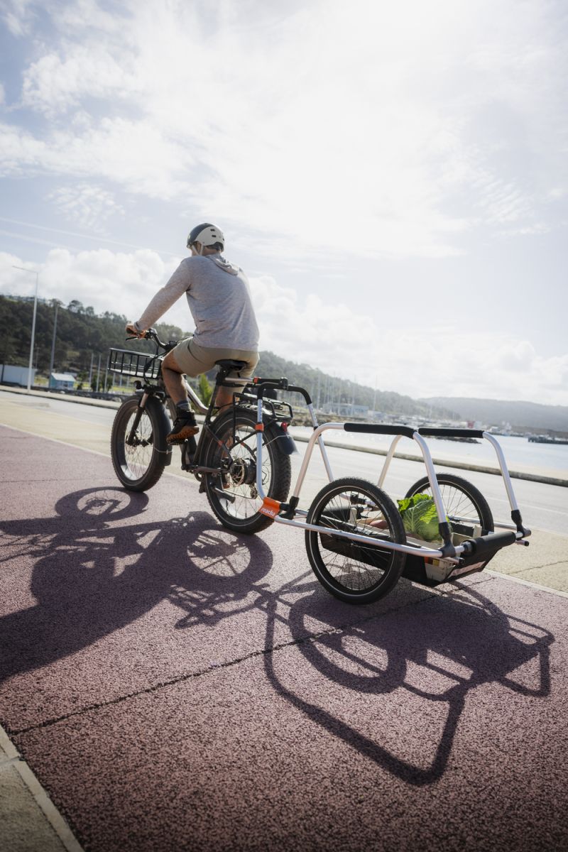 Stabilitu pri nakladaní zvyšuje praktický bočný stojan a kvalitné kolesá s rýchloupínacími osami garantujú plynulú jazdu v meste aj na nerovnom povrchu. Nastaviteľný popruh na náklad udržuje prevážané vybavenie bezpečne na svojom mieste. Odolný textilný nákladný kufrík sa prispôsobí šírke rámu a zároveň slúži ako praktické riešenie na skladovanie všetkých častí vozíka pri preprave alebo uskladnení.