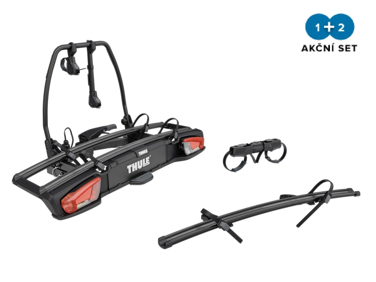 Praktický set prémiového nosiča bicyklov Thule VeloSpace 3 a adaptéra, ktorý zvyšuje jeho kapacitu na 3 bicykle.