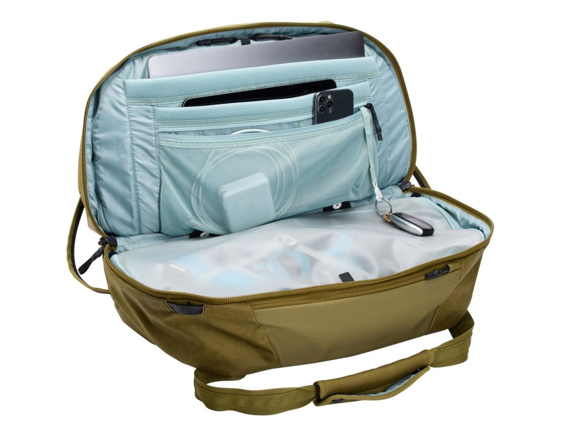 Viacúčelová taška Thule Aion s prepážkou z TPU ktorá zabraňuje šíreniu zápachu a nečistôt, tá vám umožní oddeliť špinavé predmety od zvyšku vybavenia. Túto prepážku je možné zložiť a uložiť v spodnej časti tašky.