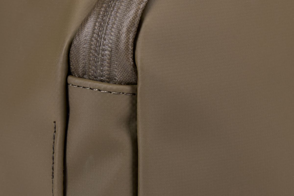 Robustný materiál z recyklovaného polyesteru s dvojitým poťahom je vysoko odolný proti špine, vlhkosti a mechanickému opotrebovaniu. Zips má polyuretánovou úpravou pre dlhú životnosť.